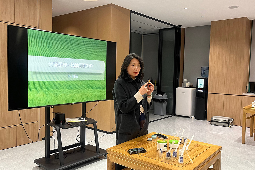 随后,活动进入了充满趣味的DIY天然护手霜制作环节。考虑到冬季干燥寒冷的气候,本次配方特别加强了保湿与修护功能。老师首先讲解了冬季皮肤护理知识,以及天然成分的益处。天然植物精油、乳化剂等原料一字排开,散发着淡淡的自然气息。在老师的细心讲解和示范下,亲子家庭化身“合作搭档”,开始了温馨的共创。