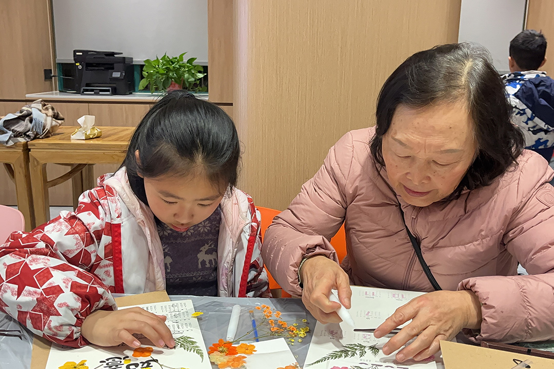 随后的干花日历手工制作环节将活动推向高潮。在工作人员和志愿者的指导下,家长与孩子们共同协作,精心挑选干花材料,巧妙设计布局,将一片片干燥却依然美丽的花瓣、枝叶细心粘贴在日历底板上。原本普通的材料在亲子间的默契合作中,逐渐蜕变为独一无二的艺术作品。活动现场充满温馨与专注。孩子们小心翼翼地将干花摆在预定位置,家长则在旁协助指导,偶尔低声交流创意想法。不同年龄的孩子展现出各具特色的创造力:年纪较小的孩子更偏爱鲜艳色彩和自由构图,而年长些的孩子则注重整体设计和意境表达。