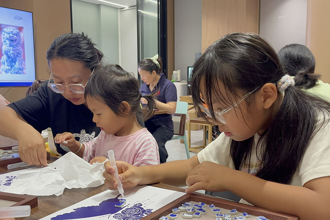 接着,进入青花瓷贴画手工环节。工作人员讲解青花瓷的历史渊源、纹样寓意及经典器型的构图美学,并指导家长和青少年共同拿起蓝白相间的材料包,创作属于自己的“青花瓷”。孩子们充分发挥想象力,家长们则从旁协助,共同构图、拼接、粘贴。不一会,原本零散的青花元素在巧手下变成了独具创意的贴画作品。