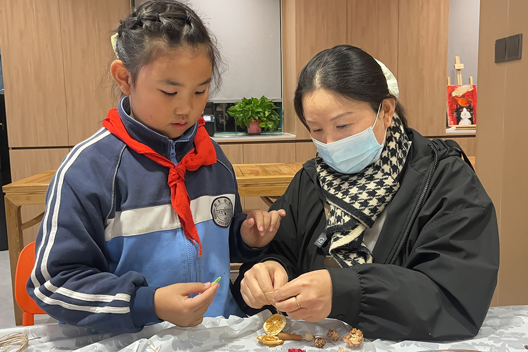 随后,便进入了最受期待的手工风铃DIY环节。工作人员向大家展示了用各种自然材料制作而成的风铃样品简要讲解了风铃的制作步骤和技巧那散发着清香的柠檬、形态可爱的松果、古朴的树枝与柔软的棉花……瞬间吸引了所有孩子和家长的目光。爸爸妈妈们与孩子一起设计风铃的造型,耐心地将丝线穿过细小的针孔。孩子们则是“首席设计师”,精心挑选干果的颜色与形状,小心翼翼地打结、固定,发挥天马行空的想象力。经过一个多小时的精心创作,一件件独具匠心的风铃作品陆续“诞生”。