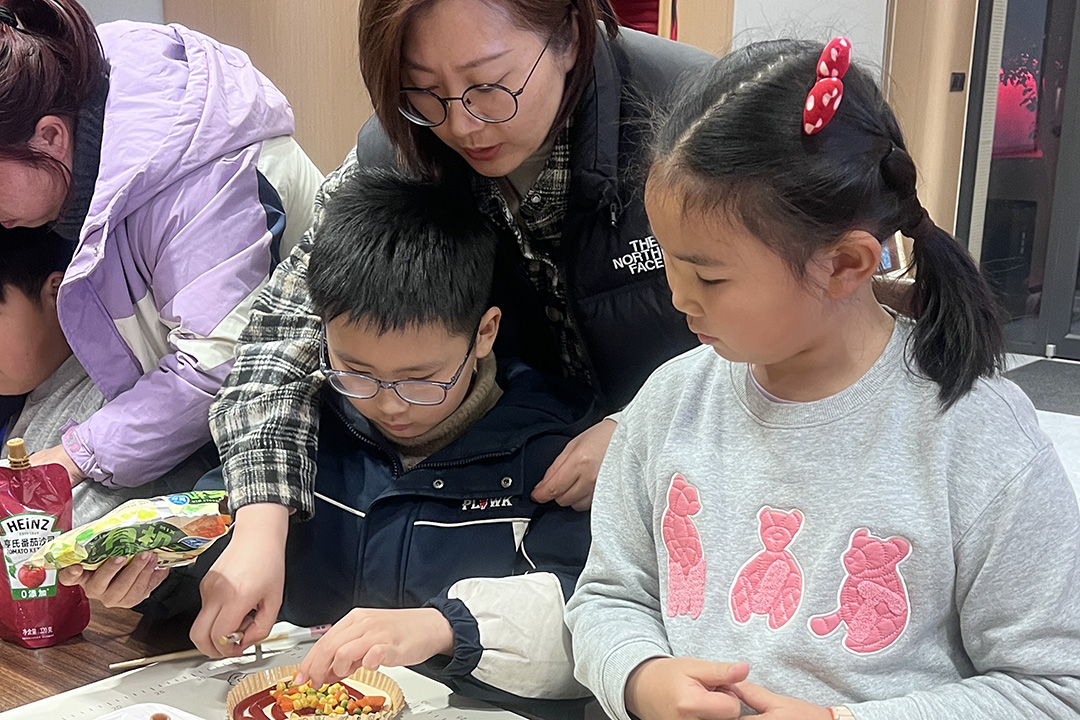 在馒头蒸制的间隙,活动进入了孩子们更为期待的DIY披萨环节。志愿者们将精心准备的食材摆上桌面:金黄的玉米粒、咸香的培根片、拉丝的马苏里拉芝士,还有翠绿的青豆,色彩斑斓,香气诱人。接着便是孩子们发挥创意的时刻:涂抹酱料、撒上厚厚的芝士、均匀铺上培根,再用玉米粒和青豆点缀出自己喜欢的图案。每一个步骤都倾注了孩子们的用心,而妈妈们则在一旁温柔注视,时而帮忙固定饼皮,时而为孩子的创意点赞。不一会儿,一个个造型各异的披萨被送入烤箱。随着温度的升高,芝士融化的香气渐渐弥漫整个空间,那是幸福的味道,更是亲子合作的甜蜜见证。